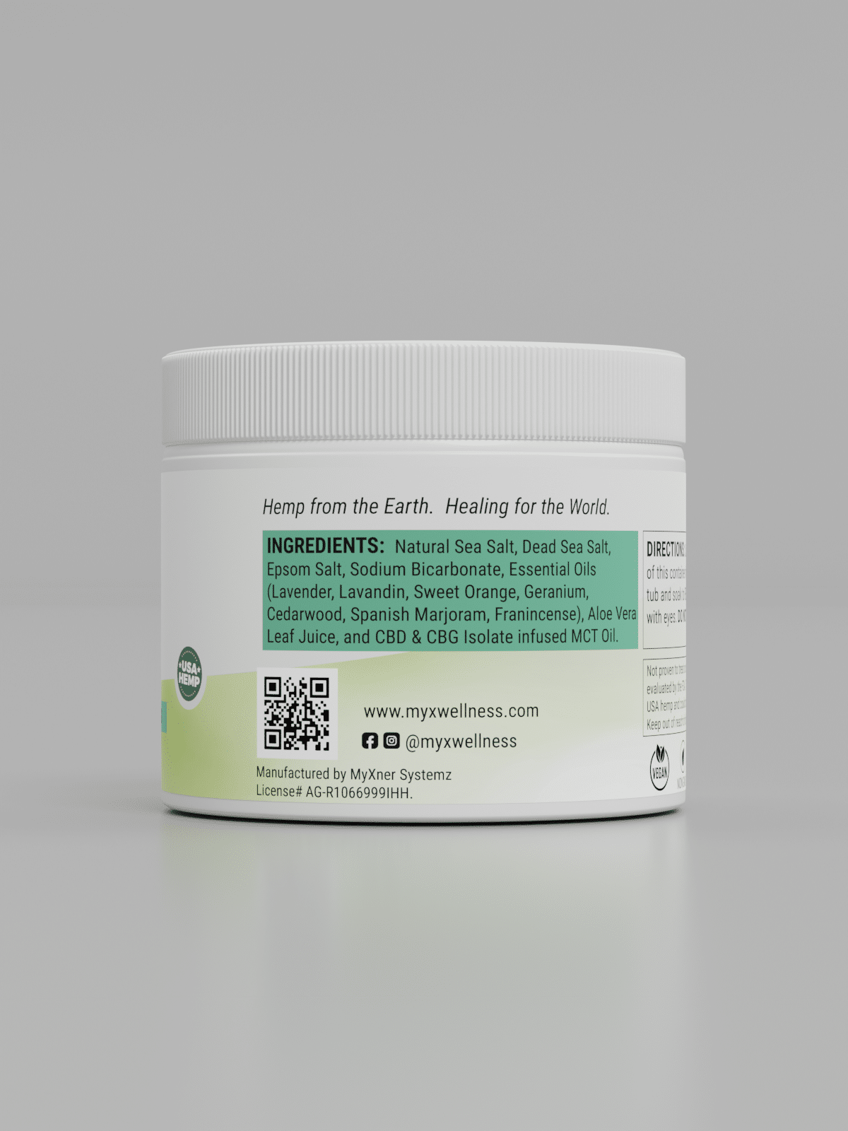Ingredients: Pacific Sea Salt, Lavender Essential Oil, Epsom Salt, Aloe Vera Leaf Juice, Water, and CBD & CBG Isolate.